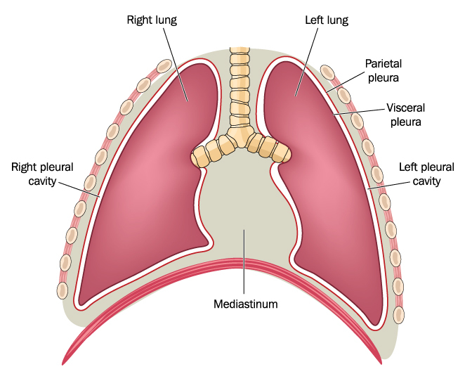 Висцеральный листок плевры плотно прилегает и сращен с тканью легкого. Париетальный листок сращен с поверхностью грудной стенки и образует как бы мешок, в котором располагается покрытое висцеральным листком плевры легкое. В зависимости от того, какую часть грудной стенки покрывает пристеночная плевра, ей присвоено соответствующее название: