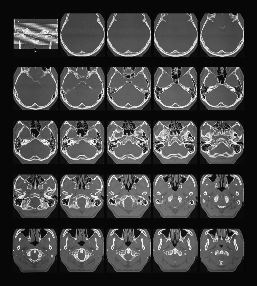 Во время диагностической процедуры пациент лежит на спине. Плоскость сканирования проходит через верхний край наружного слухового прохода и верхнюю стенку глазницы в краниальном направлении. Для сканирования используется компьютерная томография высокого разрешения с шагом 0,05-0,1-0,2 см и такой же толщиной среза.